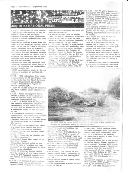 Page from Radiator of press reports relating to nuclear issues including press about the Greenham Cosmic Counter Cruise Carnival - with picture of the demolished fence