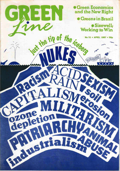 Cover: Graphic words making iceberg – Nukes Racism Acid Rain Sexism Soil Erosion Capitalism Militarism Ozone Depletion Patriarchy Animal abuse Industrialism in blue with caption above Just the tip of the iceberg in green on white
