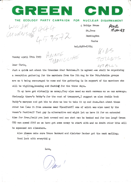 Letter from David Taylor as GreenCND to "Chris" about arrangements for meeting "Star Marchers" to Greenham