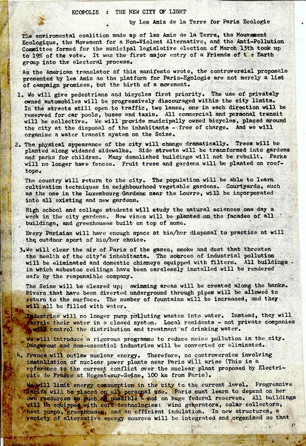 French Ecologie movement 1977 manifesto for Paris city elections.