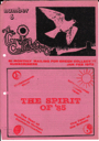 Front cover peace dove over glastonbury tor with headline "The Spirit of '85" and sub-heads "Molesworth Year, International Youth Year, The Year of Human to Human Communication and The Year of the Buffalo". News from Molesworth with a Stop Press addition on the eviction. Articles on Glastonbury Green Fields and Green Roadshow. Women's Space in Gatherings. Milton Keynes Greentown by David Olivier with sidenote from collective editorial. Letter from David Taylor re Green Grail saga.