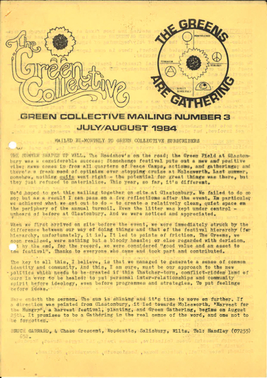 Introductory editorial by Bruce Garrard. General news including continuing fallout from 1983 Lamberts Farm Gathering and implications for Glastonbury Festival. Introducing the Green Field at Glastonbury Festival. History of the Gatherings so far. Article by Mike Bell on Designing the Future. Reviews of Heart-Land and Embrace the Earth booklets. Print of Collective Constitution (not labelled draft)