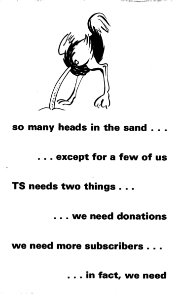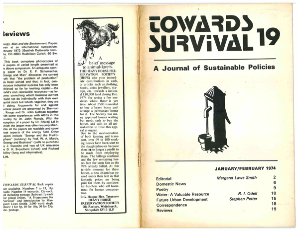 "Lament for the passing of "Toward Survival" which ceased publication for financial reasons with their last (March) issue. Started in June '72 as a discussion journal hoping to see the emergence of radical ideas for the substainable, non growth society, editor/ publisher and early days printer Keith Hudson subsidised it out of his own pocket. Laterly he has been aided in this by the efforts of Tim Bouquet.