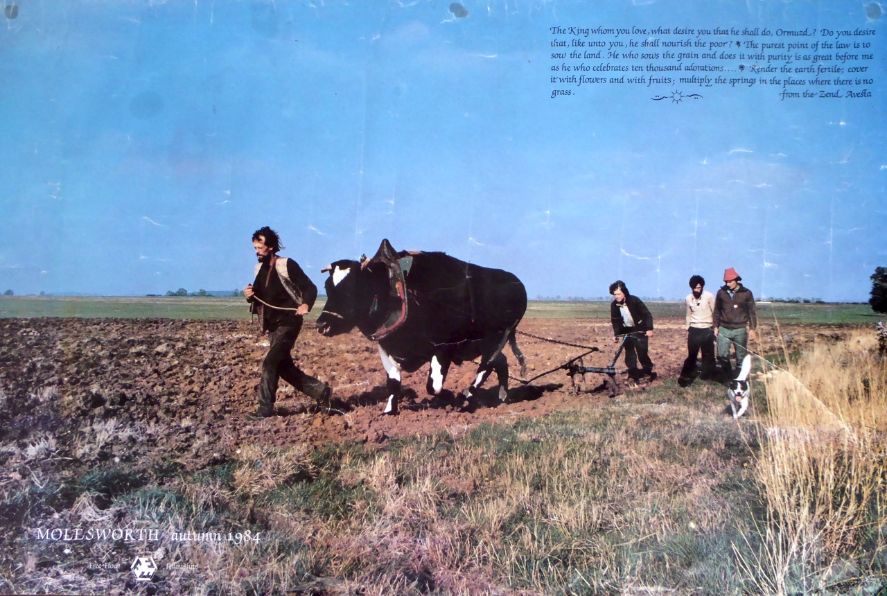 Large poster of ploughing land on Molesworth Airbase with a bull drawn plough