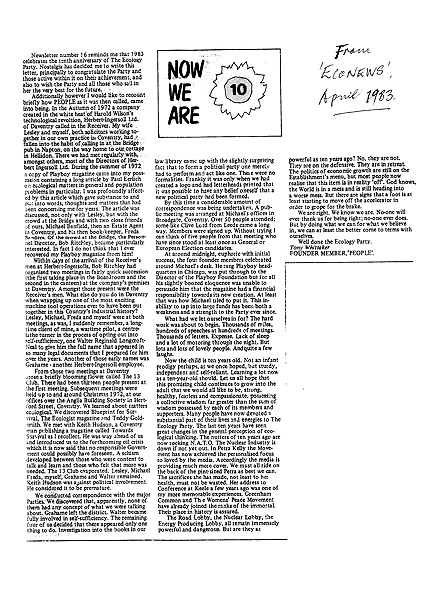 Article in EcoNews April 1983 by Tony Whittaker reflecting on 10 years of the party.