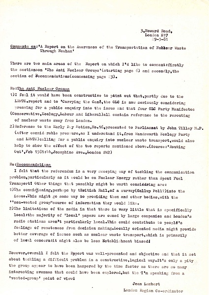 Comments on Transport of Nuclear Waste report by Jean Lambert as London Region Co-ordinator