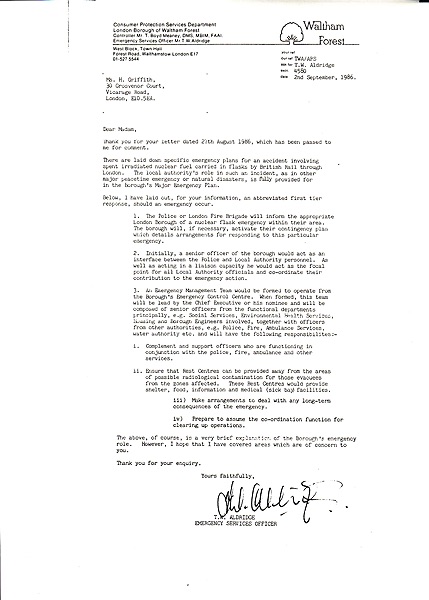 Waltham Forest Council response to Ms. H. Griffith re: nucler waste transport through the Borough.