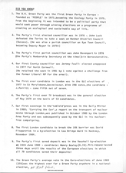 10 facts about the green party. Produced in early 1990, focusing London - usage unclear, possibly for new members in London.