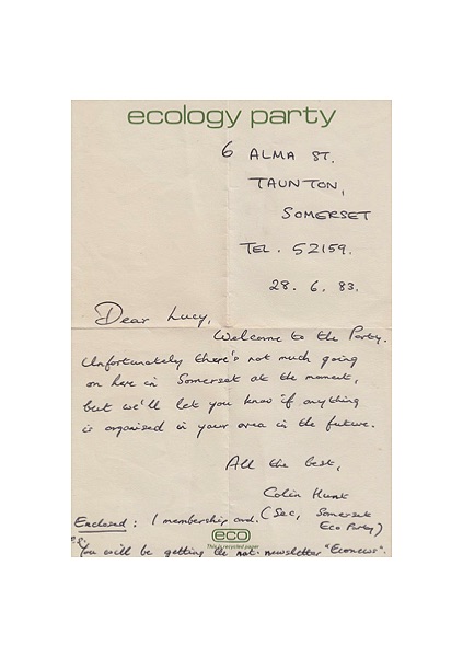 Handwritten letter to new member Lucy from Somerset secretary Colin Hunt welcoming her and apologising for the lack of activity