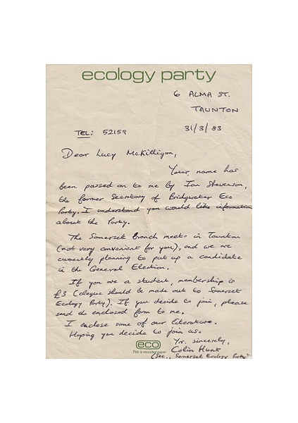 Handwritten letter to Lucy McKilligan from Colin Hunt Somerset EP secretary responding to enquiry for info and joining forms