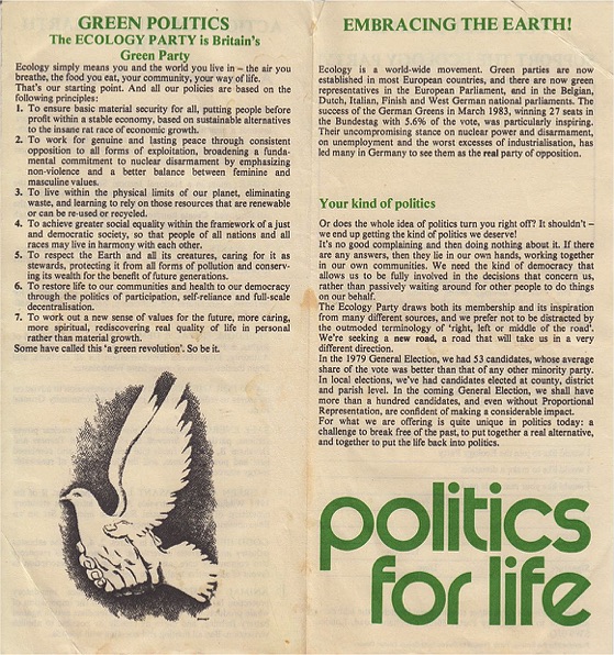 Graphic of hand holding a dove. Section on Green Politics outlining 7 principles. Action for Life on Earth 10 point action programme. Joining form