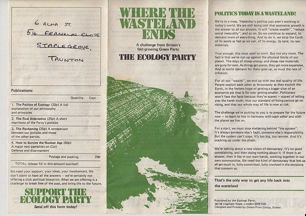 "Politics today is a Wasteland". Graphic of sea breaking on rock. "A challenge from Britains fast-growing Green Party"