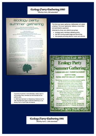 For the 2017 Green Gathering at Chepstow held from 4th-7th August we produced an exhibition on the early history of the Gathering. David Taylor and Brig Oubridge gave an entertaining talk on their memories of the early days a recording and transcript of which will appear here in due course.