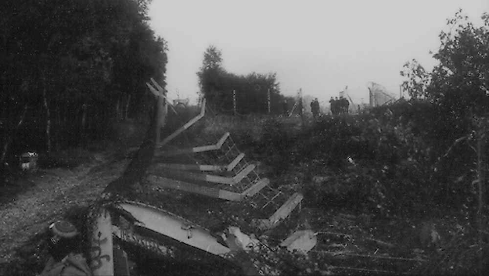 The next morning the MOD police over-reacted, rushing in mobile searchlights and bulldozers, and tearing down about an acre of trees on the inside of the fence. It was this revengeful act against trees that then provoked some folk to take sledgehammers to the reinforced concrete fence posts surrounding the base (which they found would come down easily with three good hits) and demolish some 65 of them, bringing down the gate and a substantial section of the perimeter fence.