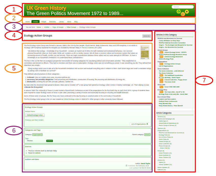 - The article information area. Links to adjacent articles, category and tags. Information about sources used for the article. Article author and date published on Green-History.