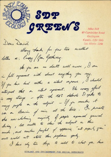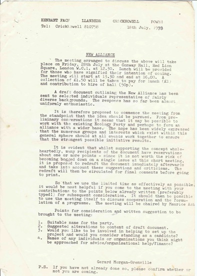 A paper proposing for a New Political Alliance initially targeting the 1979 Euro Elections with a covering letter from Gerard Morgan-Grenville, the founder of CAT in Wales dated 18th July announcing a public meeting in London on 28th July. A future article here will look at the relationship of this initiative to the growing Ecology Party and the non-political Green Alliance which was set up by Morgan-Grenville and Maurice Ash in 1979.