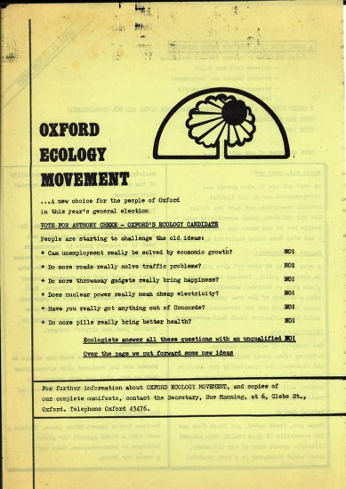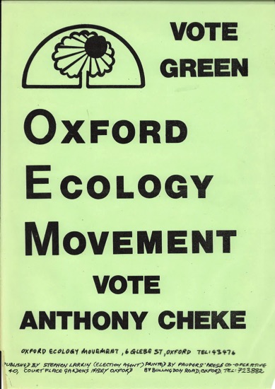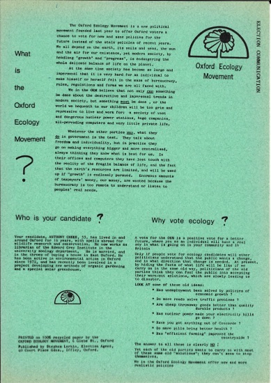 Formed in Oxford in 1978 explicitly to put up a general election candidate with a bottom-up distributed approach to organisation in contrast to the more top-down centralised approach of the national Ecology Party. Contested city and general elections in 1979 and then membership dispersed either into more on-the-ground activism or merged into the Ecology Party.