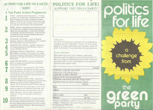 10 facts about the green party. Produced in early 1990, focusing London - usage unclear, possibly for new members in London.