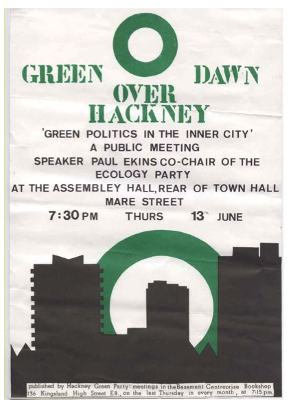 Poster for a meeting branded as Hackney Green Party published well ahead of the Conference in Dover in September which formally adopted the new name. Note the Green Ring used as a first logo.