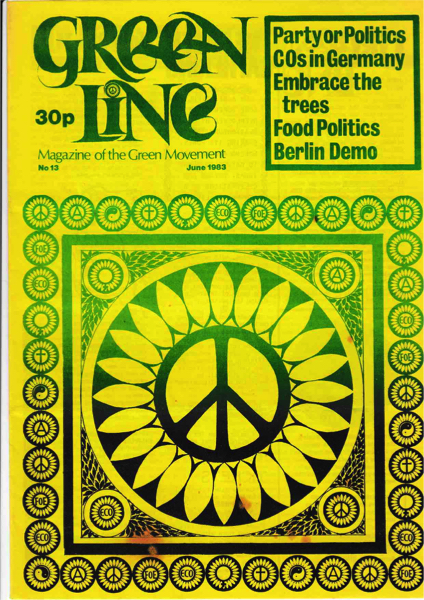 Front cover CND peace symbol in sunflower surrounded by assorted smaller sunflower logos. Title "Party or Politics. COs in Germany. Embrace the trees. Food Politics. Berlin Demo"