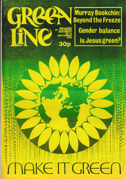 Front cover title "Make It green" under world in petals logo (possibly first use of this predating adoption as GP logo in 1985). Headline "Murray Bookchin: Beyond the Freeze. Gender balance. Is Jesus green?"