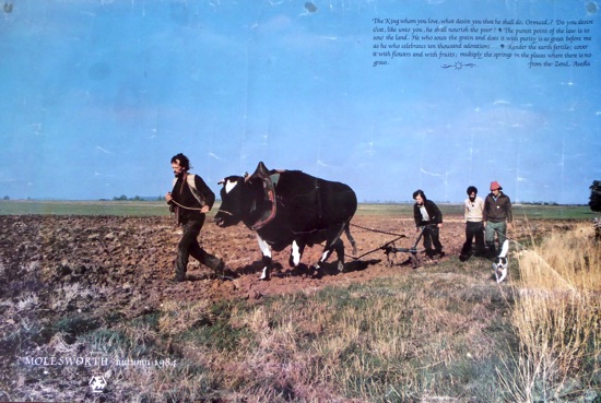Large poster of ploughing land on Molesworth Airbase with a bull drawn plough