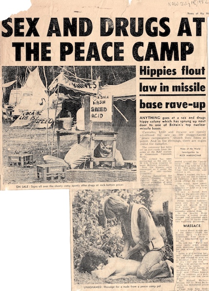 News of World (a national Sunday paper in the UK) coverage of the Greenham Festival July 1982. The photo of drug signs is known to be faked (before the days of photoshop)