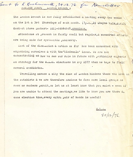 EP London Branch News sent to EcoNews Dec 1976