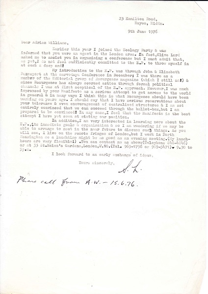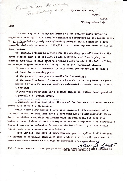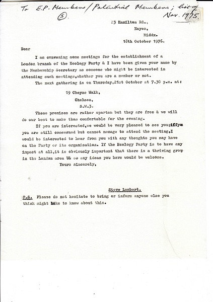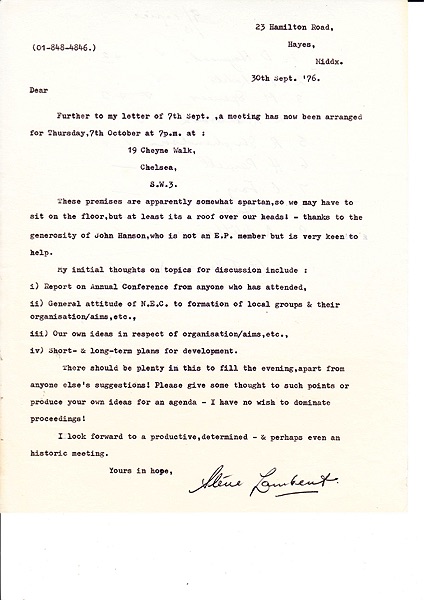 Letter inviting people to the first London EP group meeting to be held on 7th October 1976 at 19 Cheyne Walk, Chelsea.