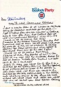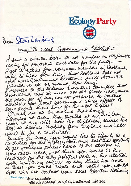 Handwritten form letter from John Davenport, to Steve Lambert giving details of the 6 AP candidates for the May 1976 Local elections and appealing for help