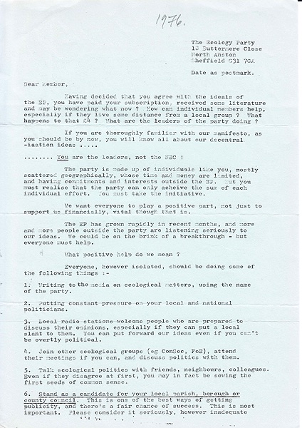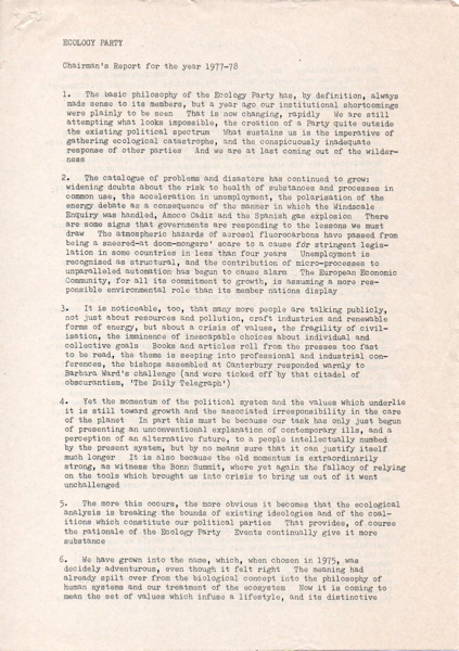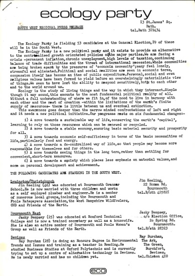 Documents relating to the Ecology Party organisation. Manifestos, Electioneering, General Leaflets, Correspondence, Press Releases, Articles
