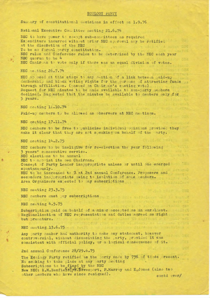 Summary of constitutional decisions made by NEC from 21st June 74 meeting through till 4th April 1976. Labelled as all decisions in force at 1/9/76.