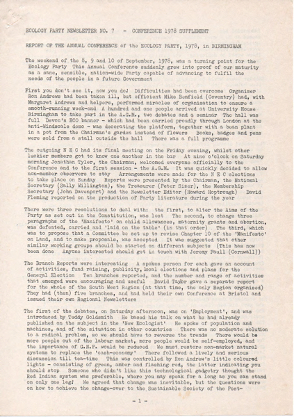Supplement send out with newsletter #7 (Jan 1979) containg a report of proceedings by Sally Willington, report of the 'Technology' discussion by David Kemball-Cook, NEC election result, further comments by Sally, unsigned report on 'Values and Philosophy' discussion (led by J.Porritt) - possibly by Howard Hoptrough as editor.