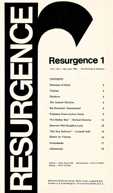 Both Nuclear (power and weapons) and Peace concerns were essential elements of the precursors to the founding of the political green movement. For example the very first issue of Resurgence in May 1966 carried feature articles on Vietnam, Frodsham Peace Action Centre, War Resisters International, and Aldermaston. Satish Kumar, who took, over as editor in 1970, had made his name as a peace activist in 1962 by walking from India to Moscow, Paris, London and Washington (the then "nuclear" capitals) and speaking with the leaders of those nations on the need for detente and peace between nations.