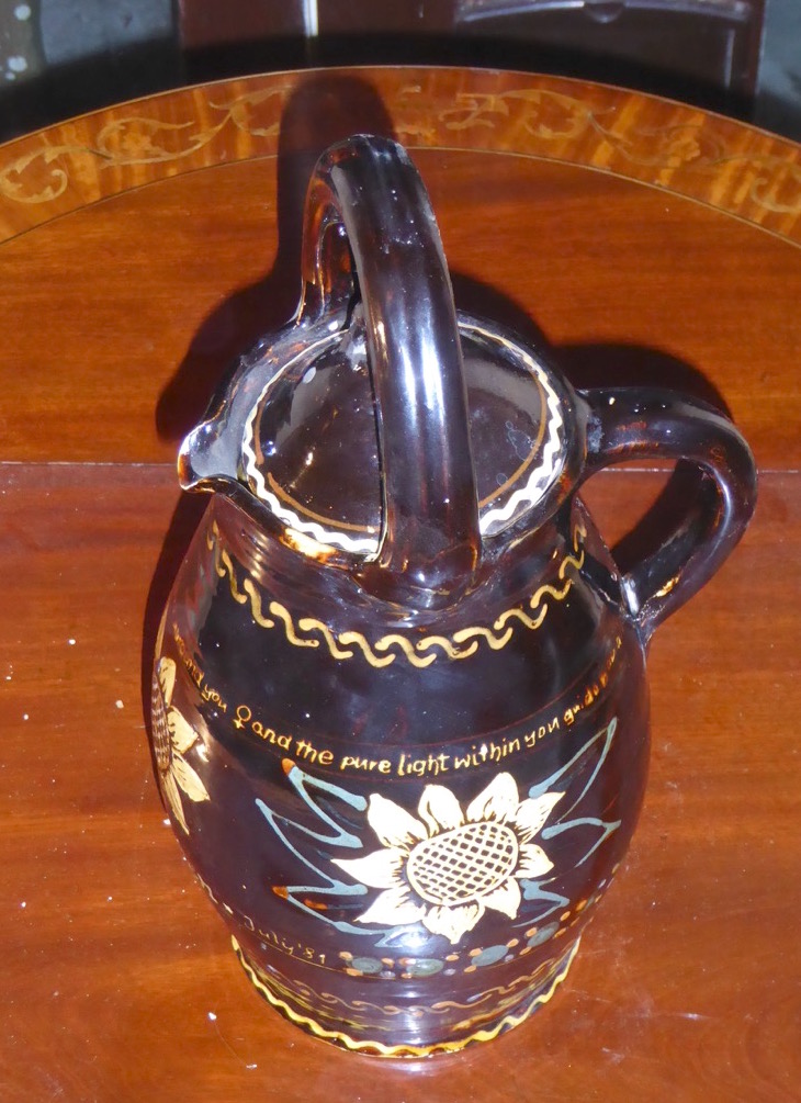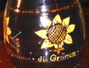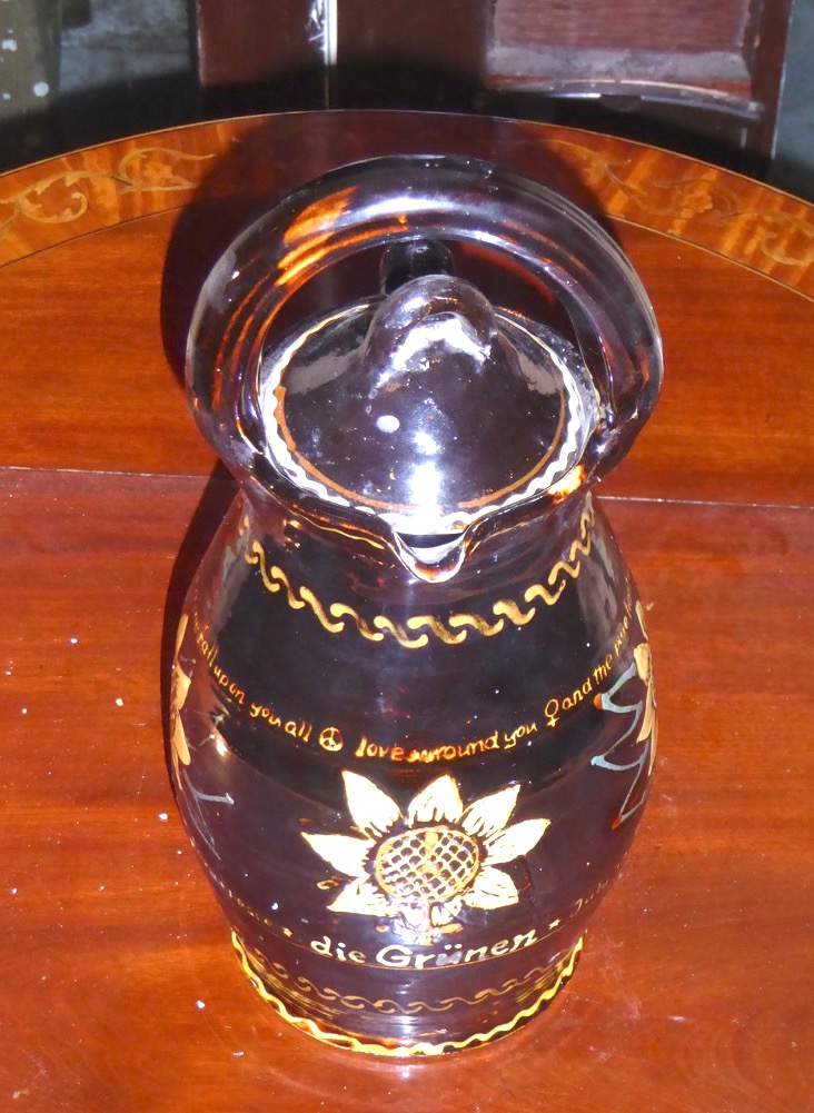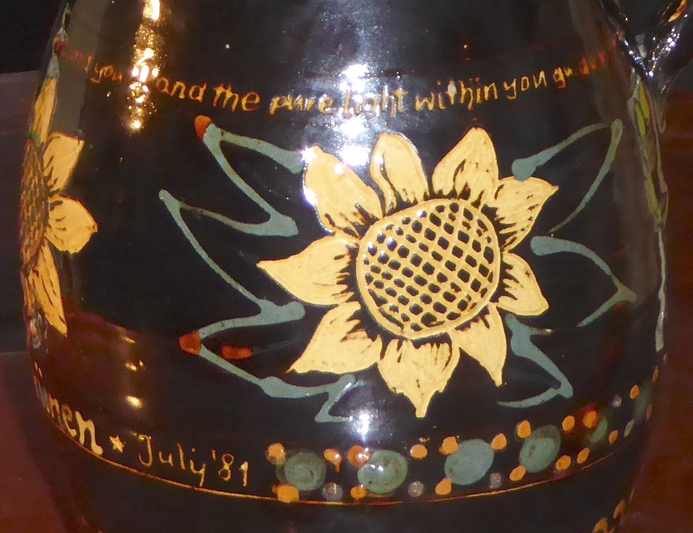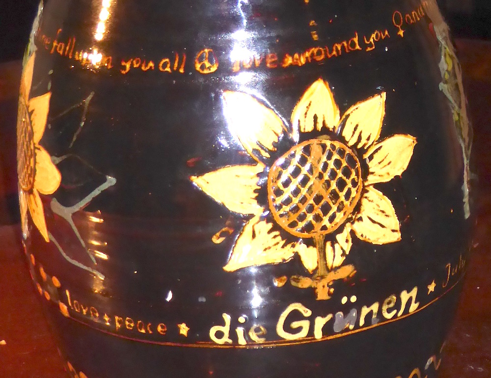 {/simplepopup}Petra Kelly of Die Grünen had been invited to come and speak at the 1981 Ecology Party Summer Gathering. In the event she was unable to attend, but sent two women, one of whom was called Bonnie, from Die Grünen in her place. She also sent a large glazed earthenware jug decorated with sunflower symbols and inscribed with some lyrics.