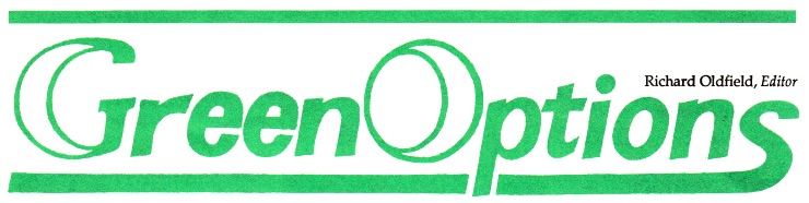 "Welcome to the first issue of Green Options! This new publication will feature regular, positive reports on the spread and evolution of green ideas, including the greening of politics and of various groupings in society at large. Special emphasis will be placed on fresh developments in green thought or action, and the advance green ideas into new, sometimes more "respectable" pastures."